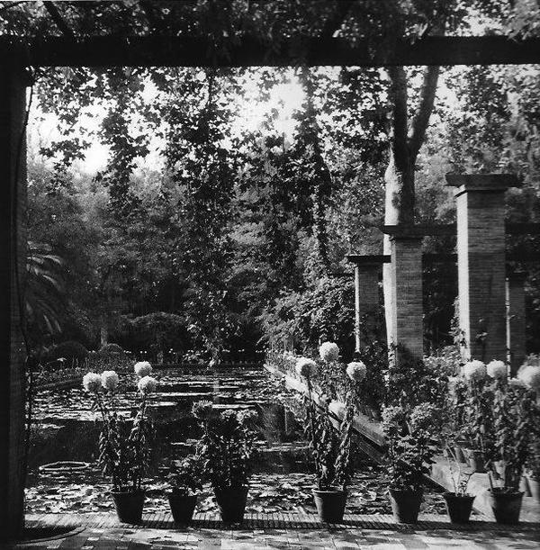 En esta foto, tomada durante el año de la Exposición Iberoamericana, destaca la presencia de un ejemplar de platanero que atraviesa la pérgola, individuo que sigue vivo hoy como antiguo habitante del parque.
